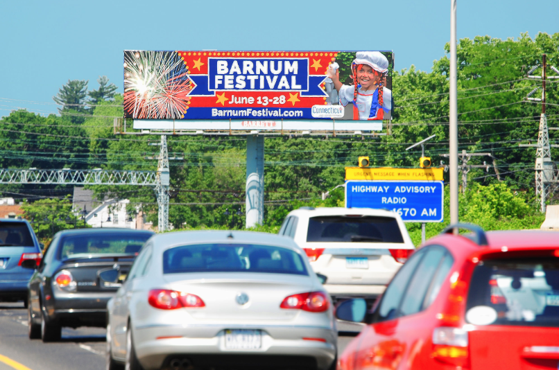 Bob Abbate Marketing, LLC., is no amateur to great design. Less experienced designers would place the blue and red too close, and cause a disturbing blue/red vibration across the sign. By separating the blue and red with strong white lines and touching up the child’s smile and face, Bob Abbate Marketing made their clients sign sing with joyful legibility. They chose clean fonts, big letters, pure emotion, a great face and costume, and tied it all into one message: Fireworks at the Barnum Festival makes a happy child! It looks so simple, but great care helped this sign deliver 522,921 daily impressions and the winner of Barrett’s Best Billboards, summer of 2015.