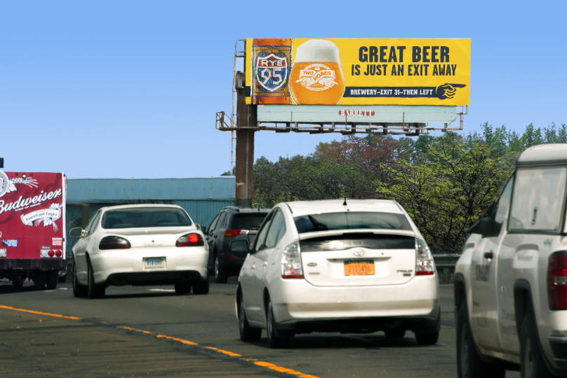 Two Roads Brewery sits a mile off I-95 exit 31, and this sign, with great graphics, clear simple text, crisp fonts, and a touch of old world charm, fills the house with eager customers, and makes this award winning ad jump to the front of the line. Congratulations Two Roads Brewery, Rye 95, Winner of Barrett’s Best Billboards, Spring of 2015.