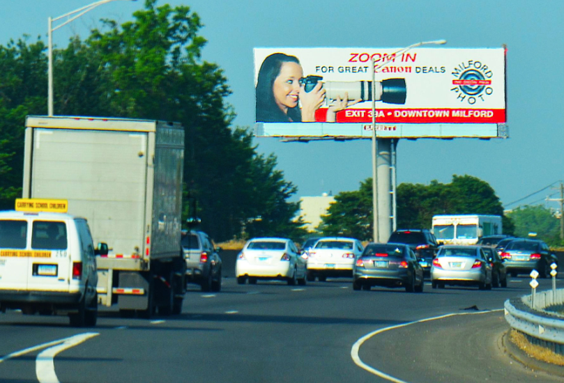 From a thousand feet away, you are gripped by the happy face of a woman holding a billboard sized zoom lens. The shape and contrast of skin tones, hair, smile, lens, and background guide your eyes down the lens to rest on the emblem of Milford Camera. The double meaning of the word “zoom,” referring to the zoom on a camera and to zoom into the store – is clever and memorable. The white on red banner at the bottom gives directions to the store. The message is clear and fun at the same time, while using the phrase “for great Cannon deals” ensures that the viewer is also aware that the store carries high quality products. This is great Outdoor, so congratulations Milford Camera, Winner of Barrett Best Interstate, summer of 2013!